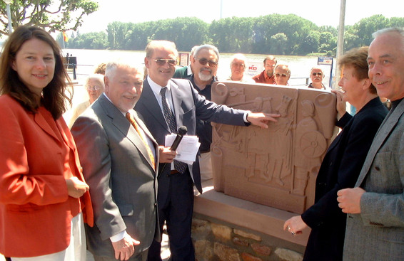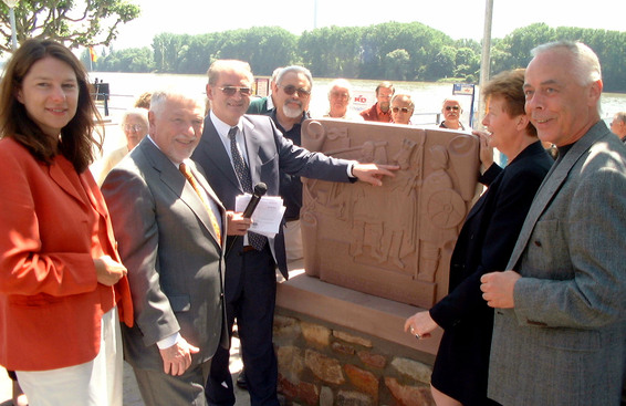 Das Sandsteinrelief an der Uferpromenade wurde von Bildhauer Jürgen Poths geschaffen und erinnert an die erste schriftliche Erwähnung Biebrichs in den Fuldaer Annalen 874. Es zeigt, wie König Ludwig der Deutsche in „Biburg“ ein Schiff besteigt. Auf der anderen Seite ist das Biebricher Wappen abgebildet.