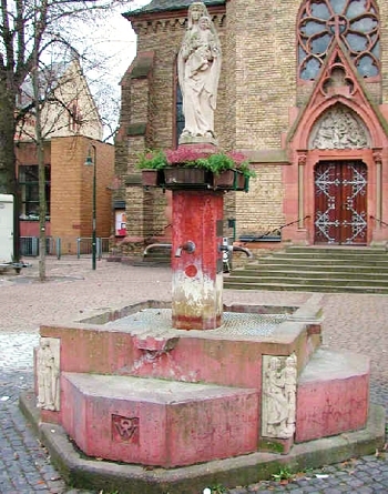 Der Marienbrunnen wurde auf Wunsch von Pfarrer Alfred Bausch auf dem Vorplatz der katholischen St. Marien-Kirche errichtet. Säule und Brunnenschale sind aus Stahlbeton in rotem Sandstein-Farbton hergestellt. Die anspruchsvolle Arbeit stammt von Auszubildenden der Firma Dywidag.